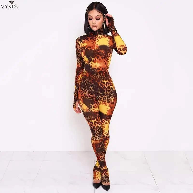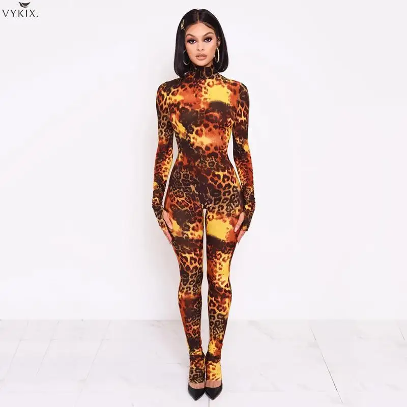 Spring Summer Skinny Jumpsuit Women Romper Turtleneck Sexy Jumpsuit Long Sleeve Leopard Print Night